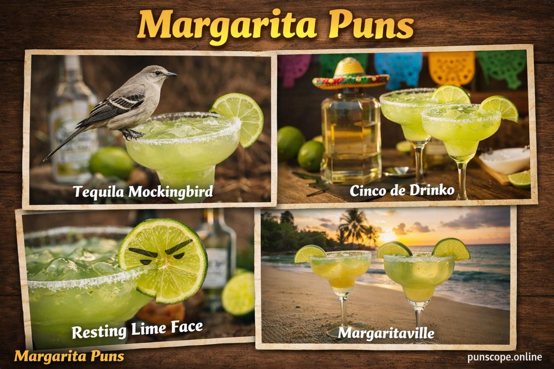 Margarita puns are cocktail-themed jokes using tequila, lime, salt, and party wordplay.